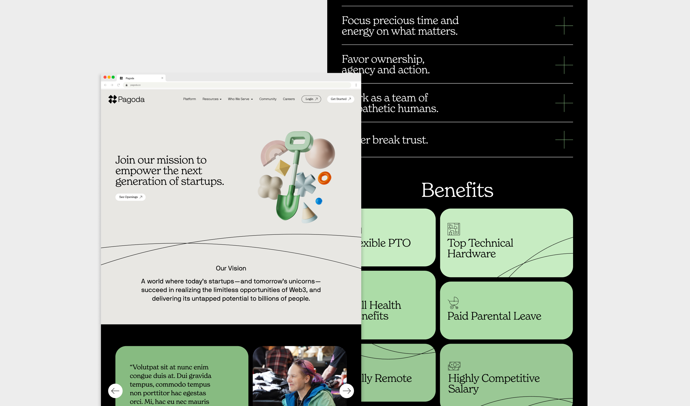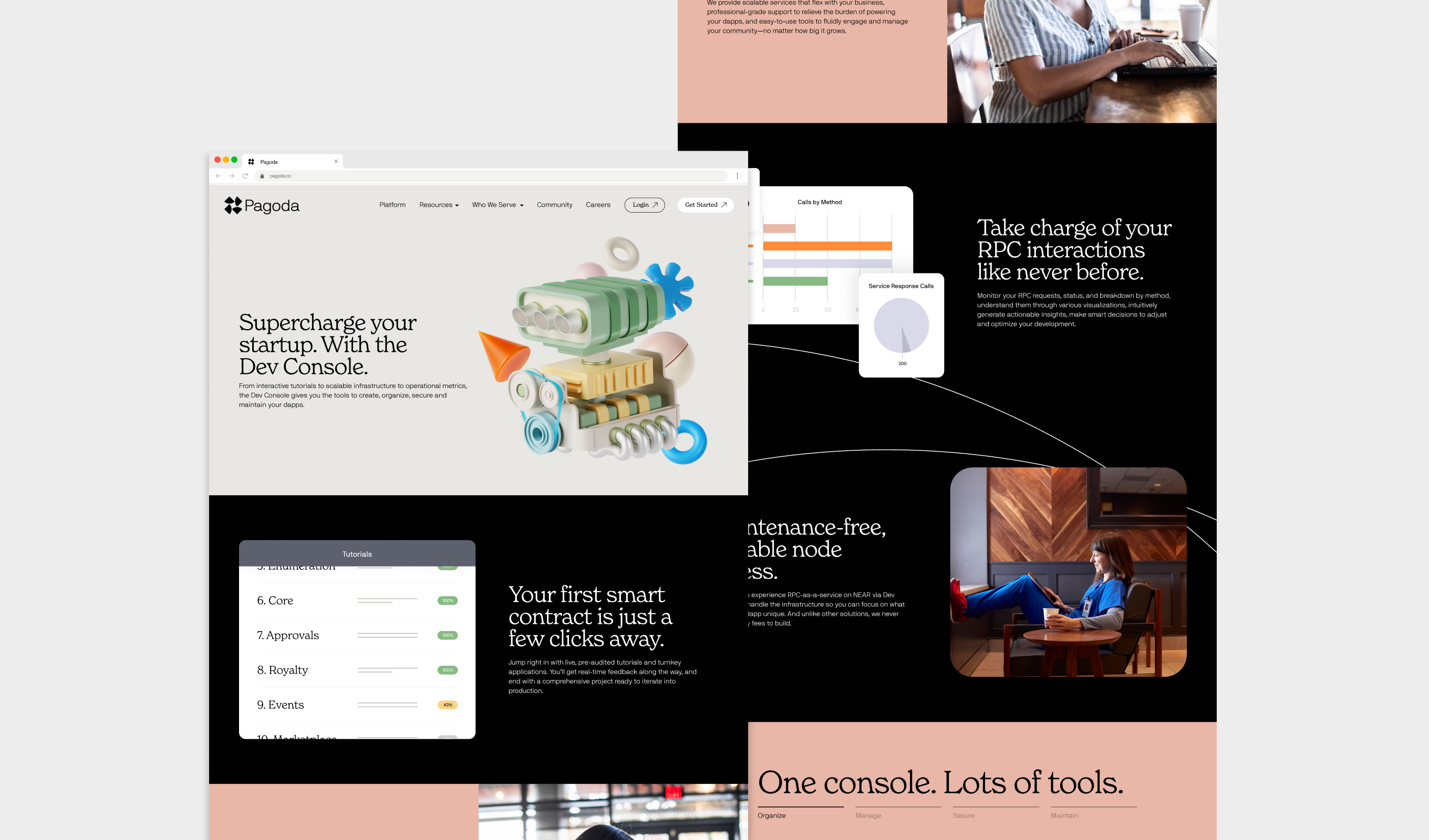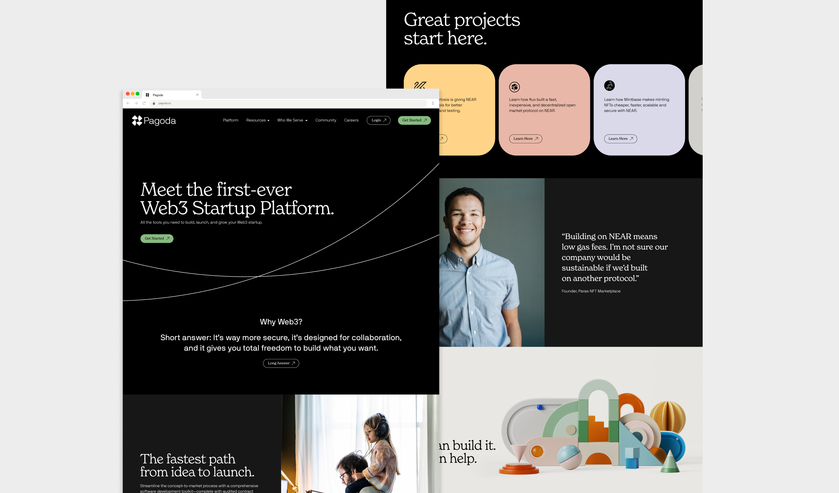 In late 2021, blockchain powerhouse Near Protocol came to us with a bold vision for a new platform, one where anyone—from Web3 pros to would-be founders with no blockchain experience—could build something great on Web3. We helped them name it Pagoda, and wrote their category strategy, positioning them as the first Web3 Startup Platform. We then designed the Pagoda brand and website, centered around their vision for a more open and accessible digital world.