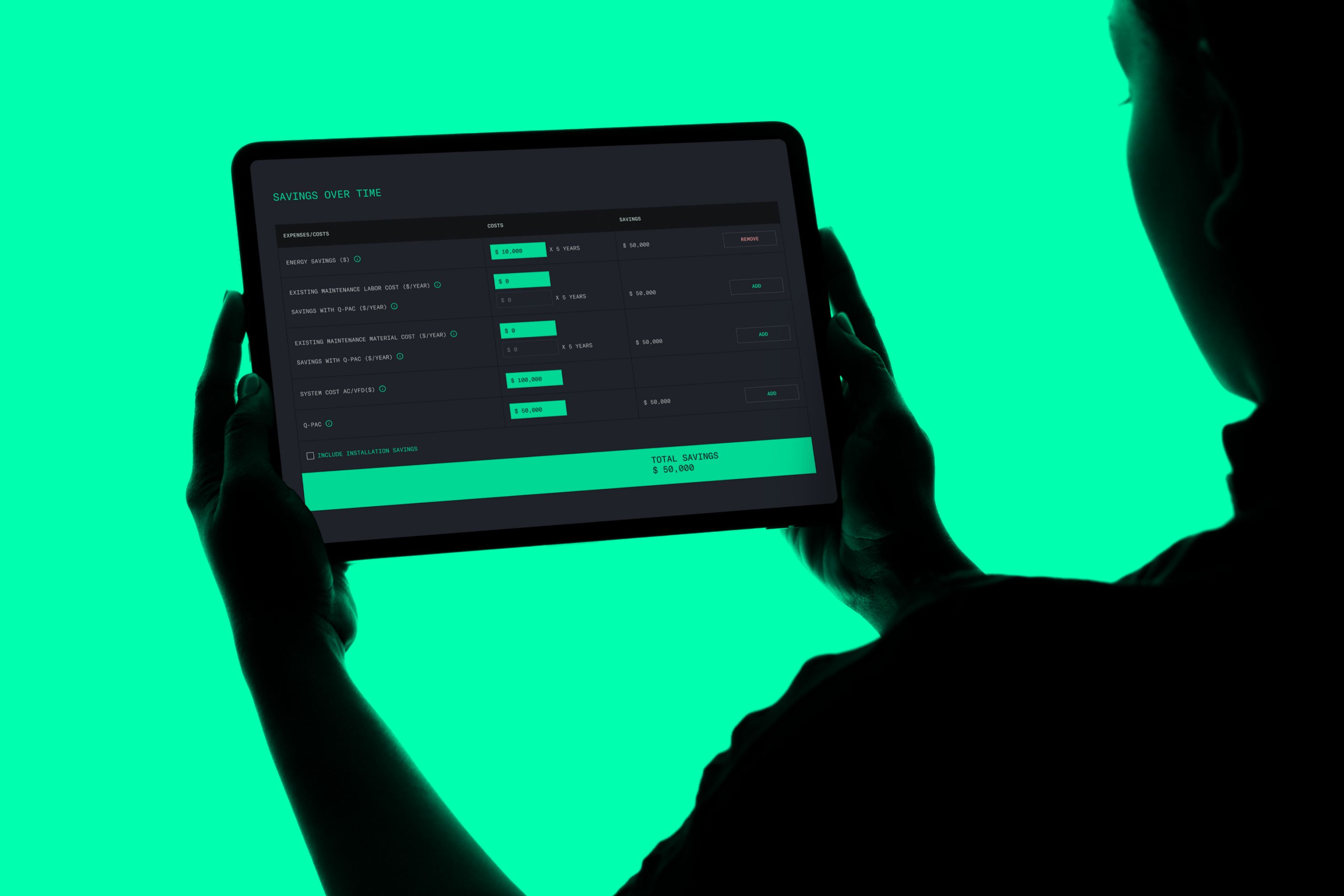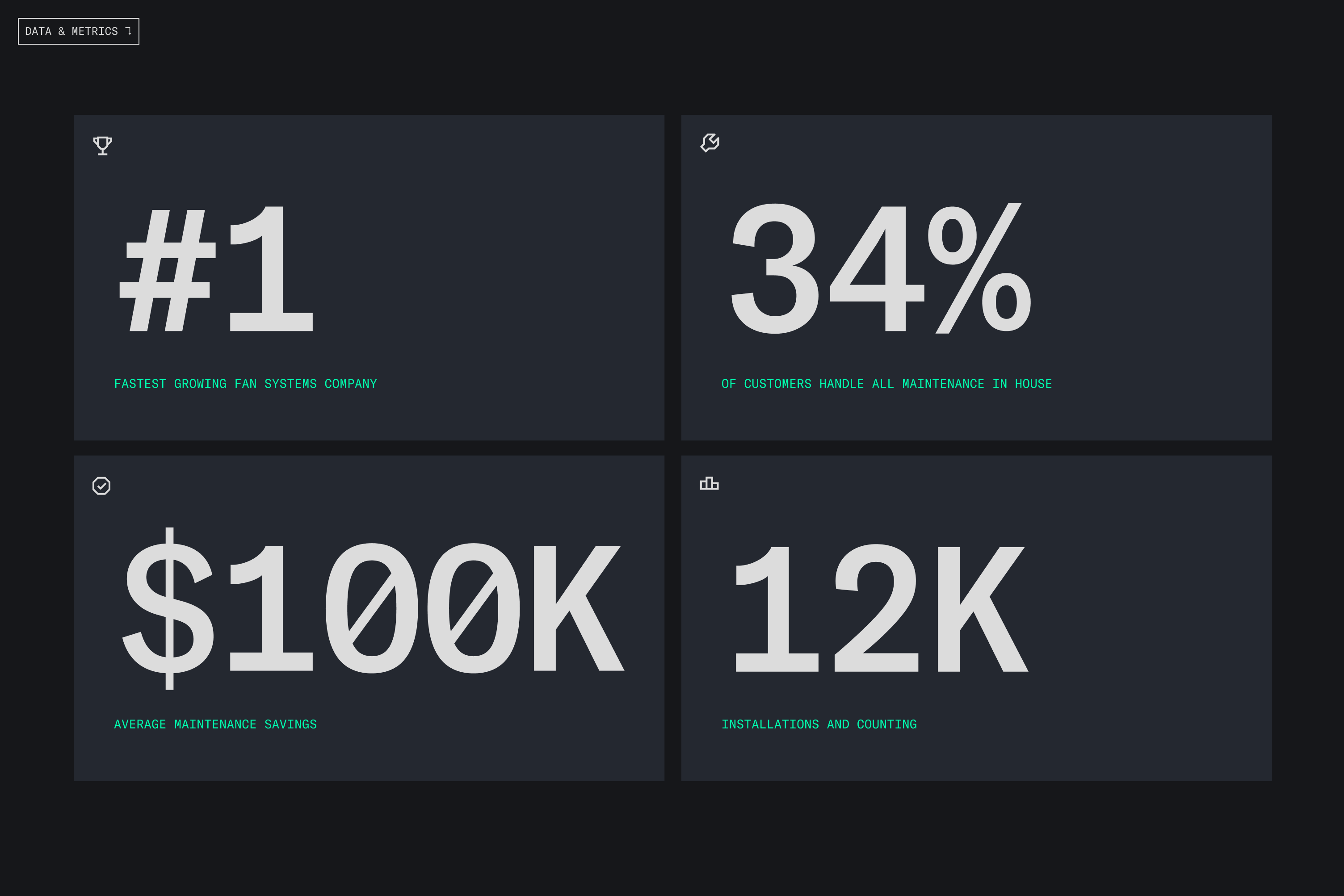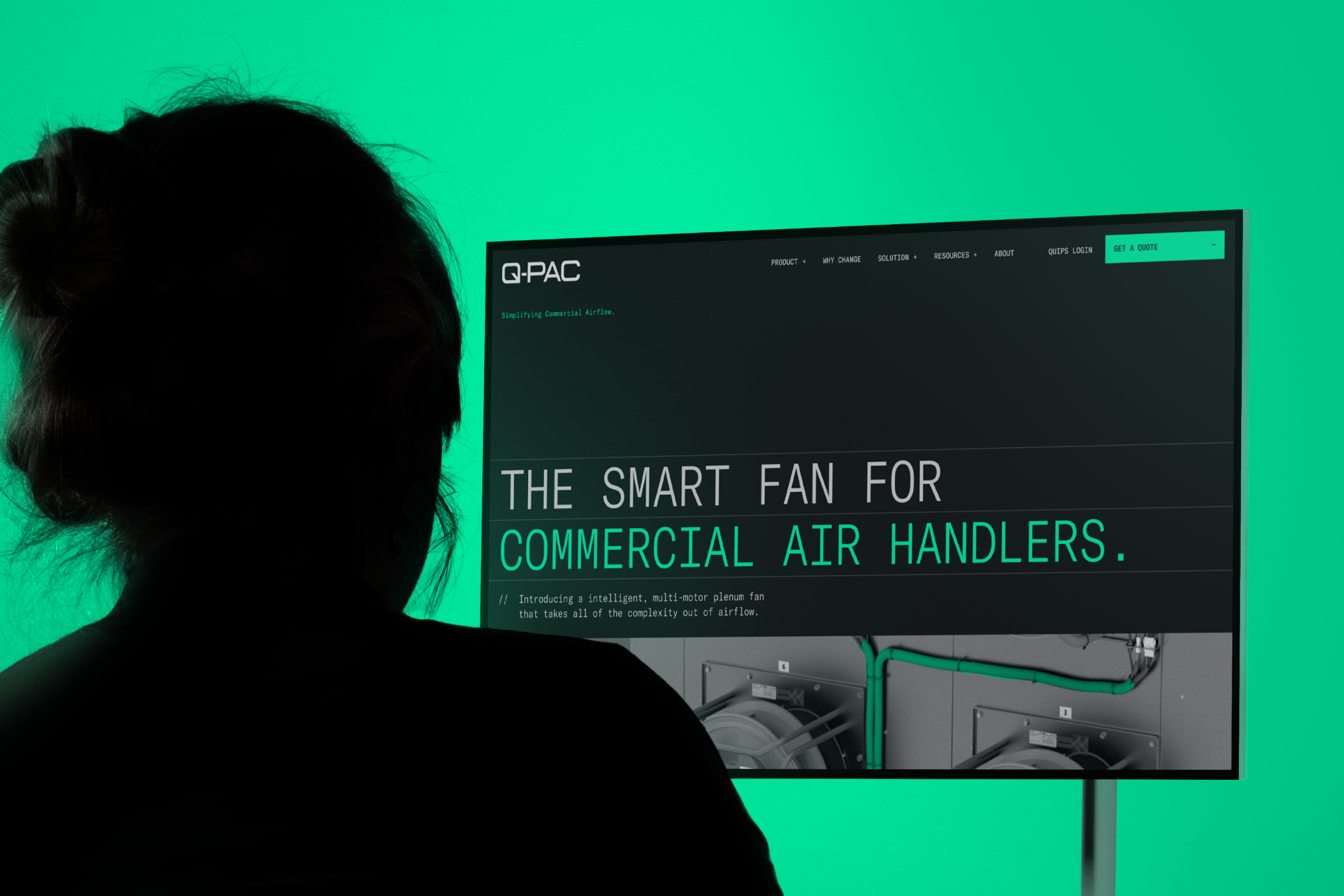 1) We put everything in a dark, techy world, effectively showcasing Q-PAC’s novel innovations while also standing apart from every other commercial fan company. To contrast the darker tones, we added bright, saturated greens that represent the life airflow gives to a building.