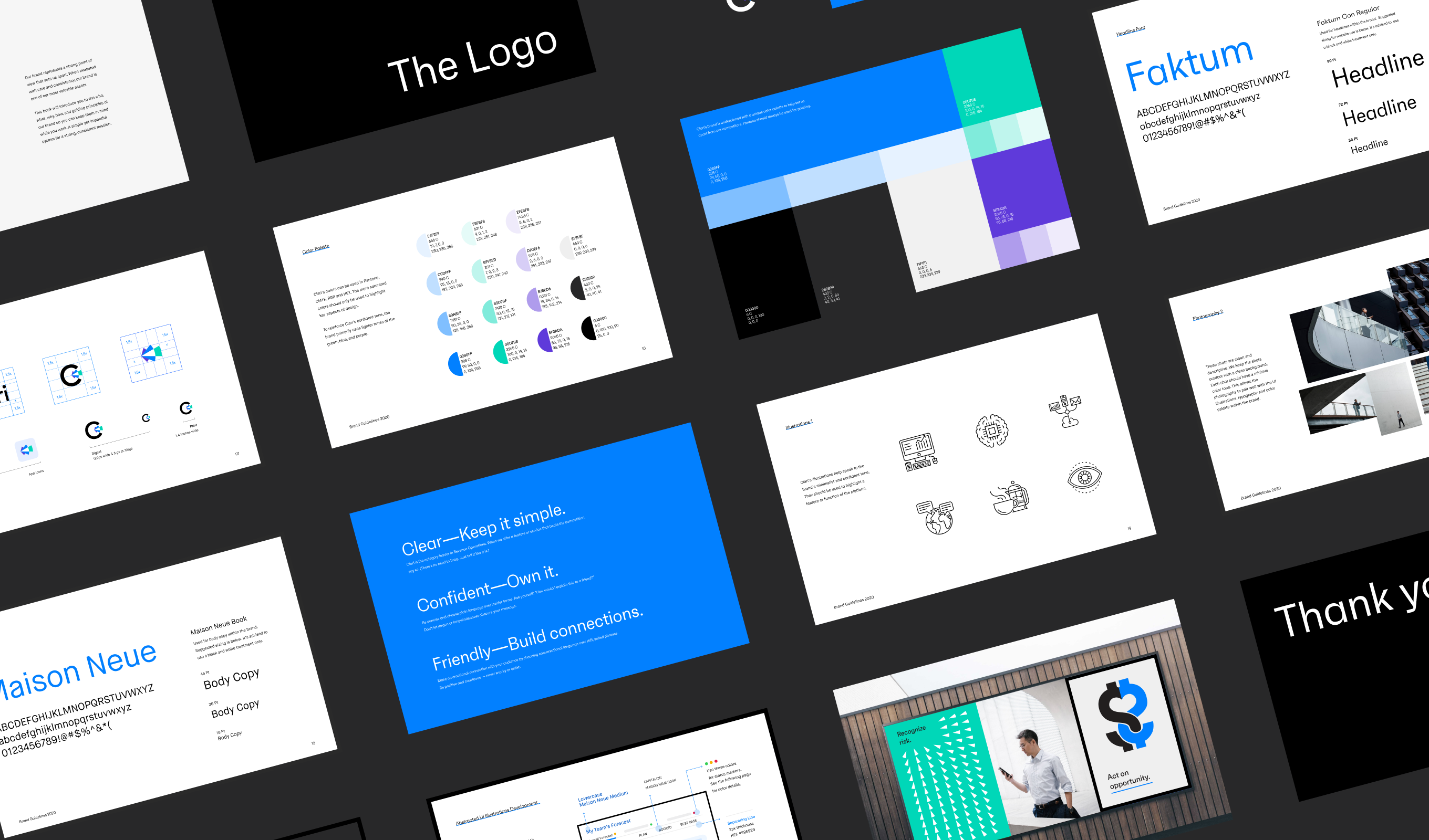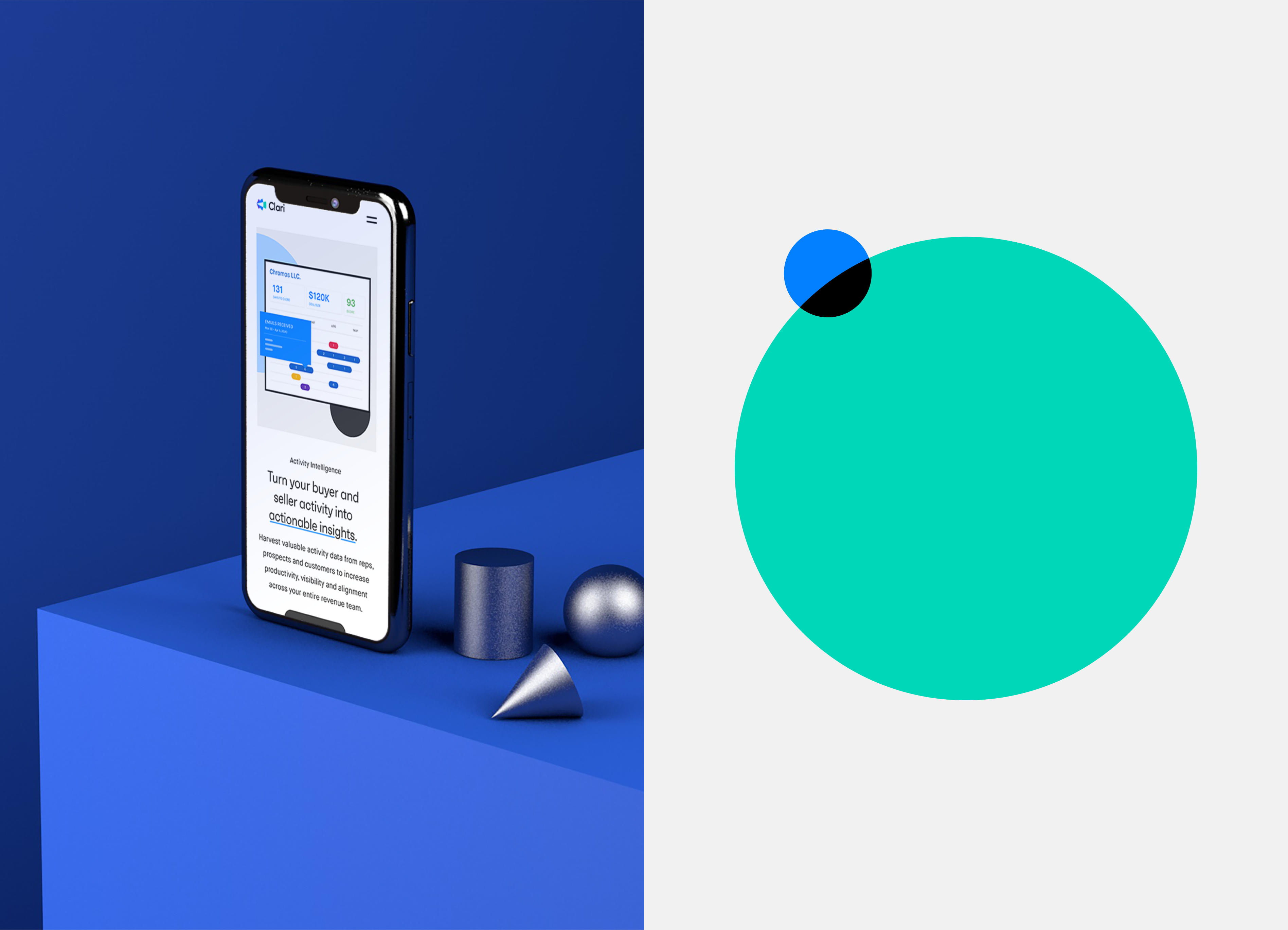 After fully refining the brief, we moved on to their new logo and brand. We landed on a logo that illustrates what sets Clari apart as the leading Revenue Operations Platform. It’s both an arrow looking inward, pinpointing useful data and information, and an eye, looking into the future, accurately forecasting revenue. We took these themes of clarity and vision and used them as a basis for our brand design work.